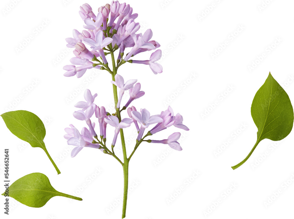 Branch of lilac flowers isolated. Lilac flowers with leaves.