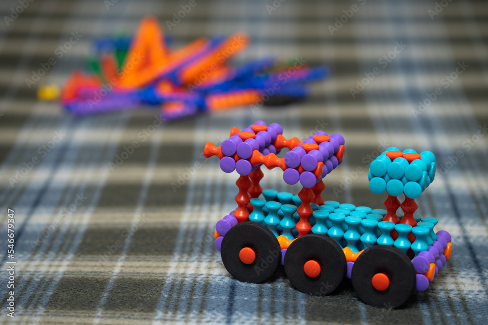 Banchamm construction constructor for children. A locomotive made of multicolored parts of the designer. Games that develop fine motor skills in a child.