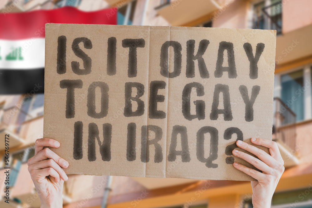 The question " Is it okay to be gay in Iraq? " is on a banner in men's hands with blurred background. Friendly. Passionate. Contact. Date. Dating. Lover. Partner. Boyfriend. Pleasant. Approval
