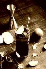 Cuba libre cocktail cold and refreshing drink for summer days on a wooden table with ice and slices of lemons
