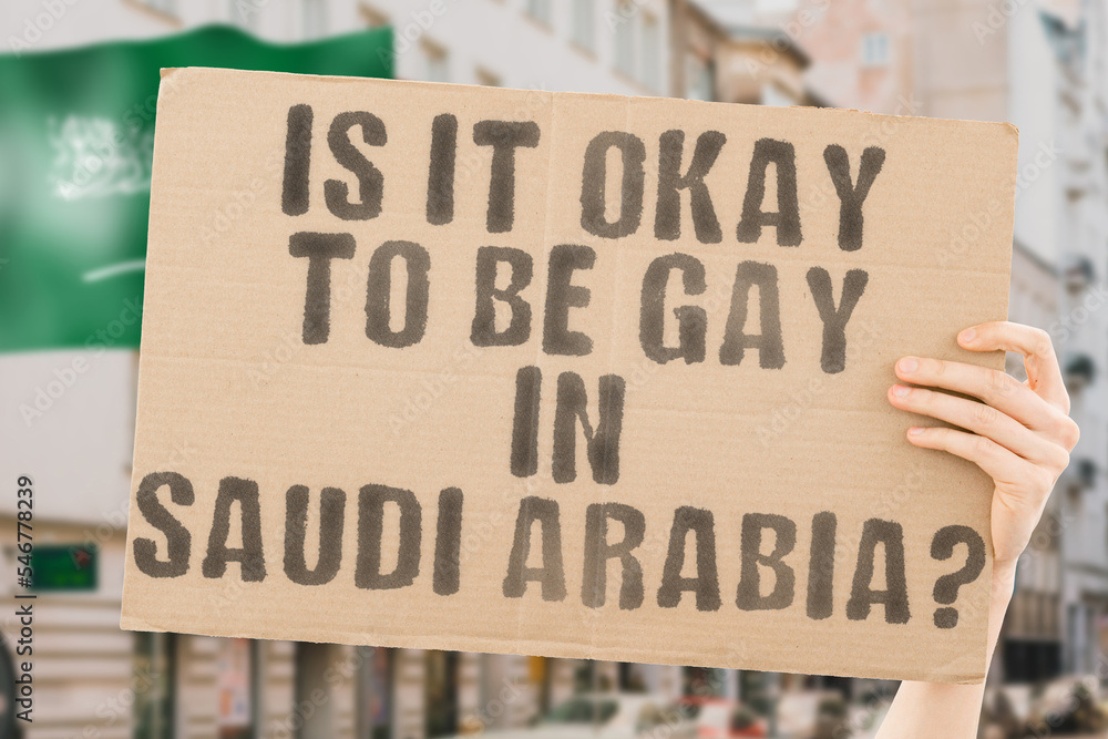 The question " Is it okay to be gay in Saudi Arabia? " is on a banner in men's hands with blurred background. Friendly. Passionate. Contact. Date. Dating. Lover. Partner. Boyfriend. Pleasant. Approval