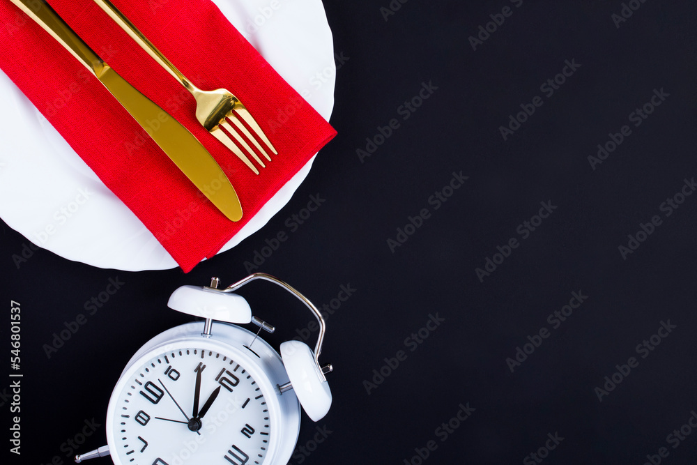 Top view of Christmas table setting and white alarm clock on the black background. Copy space. Close-up.