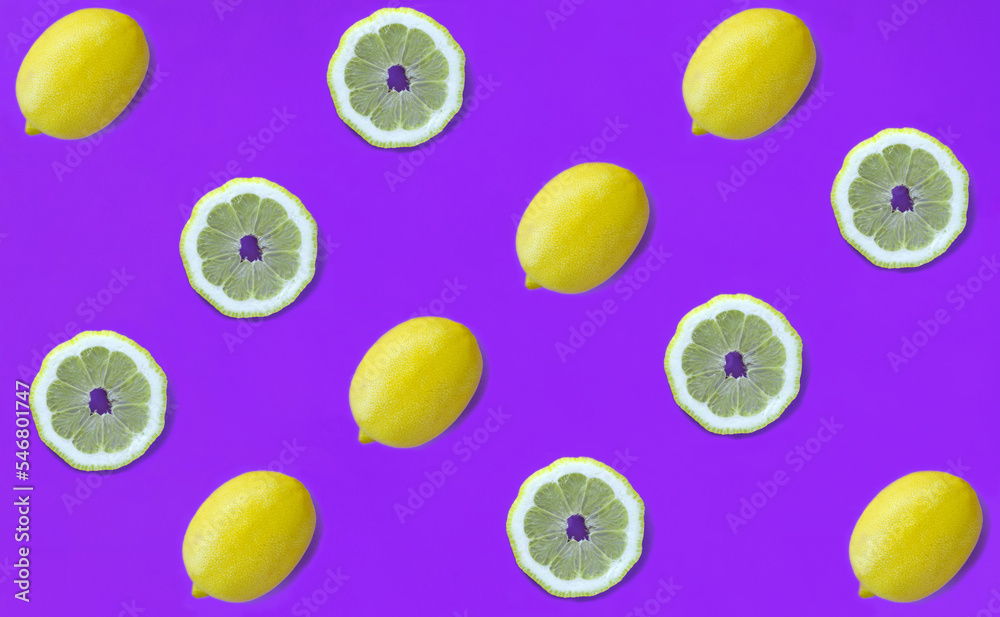 Whole and cut lemon on the purple background. Flat lay. Pattern. Top view.