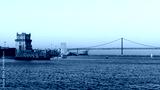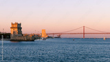 Panorama of Belém in Lisbon, the capital of Portugal. Sunset over Tagus river. Cityscape with Torre de Belém, Belém Tower and red iconic 25 de Abril Bridge, 25th of April Bridge.