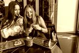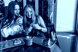 Two girlfriends using smartphone in a cafe bar
