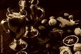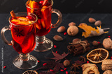 Two glasses with mulled wine and dried fruits on a dark background. Traditional autumn and winter drinks.