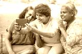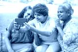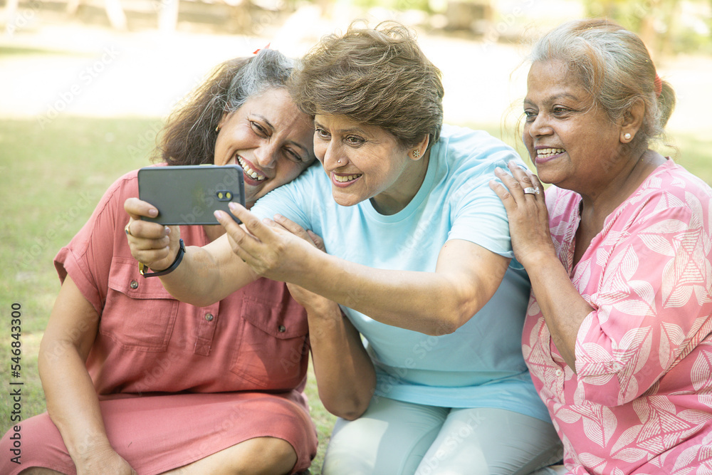 Happy Indian senior women using smart phone and taking pictures of themselves together outdoor at summer park. Elderly people clicking selife .