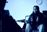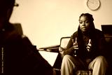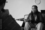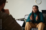 Young African American girl sitting on sofa and discussing her problems with psychologist at office