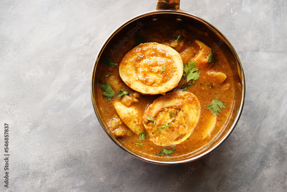 Egg Curry or Anda masala gravy, baida curry. Indian spicy food. Indian nonvegetarian Homemade food. Perfect Indian lunch. over moody background with copy space.