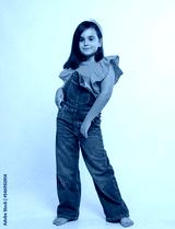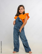 Fun cheerful happy little kid girl in orange shirt and cowboy dungarees posing gesturing hands isolated on white background children studio portrait. People childhood lifestyle concept.