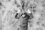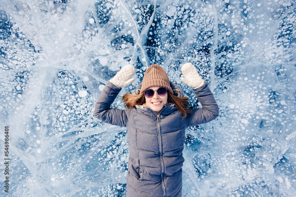 Travel winter Lake Baikal, happy joy woman tourist lie on ice sunset, top view