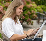 Working online on a tablet and laptop in a cafe. Business conference online