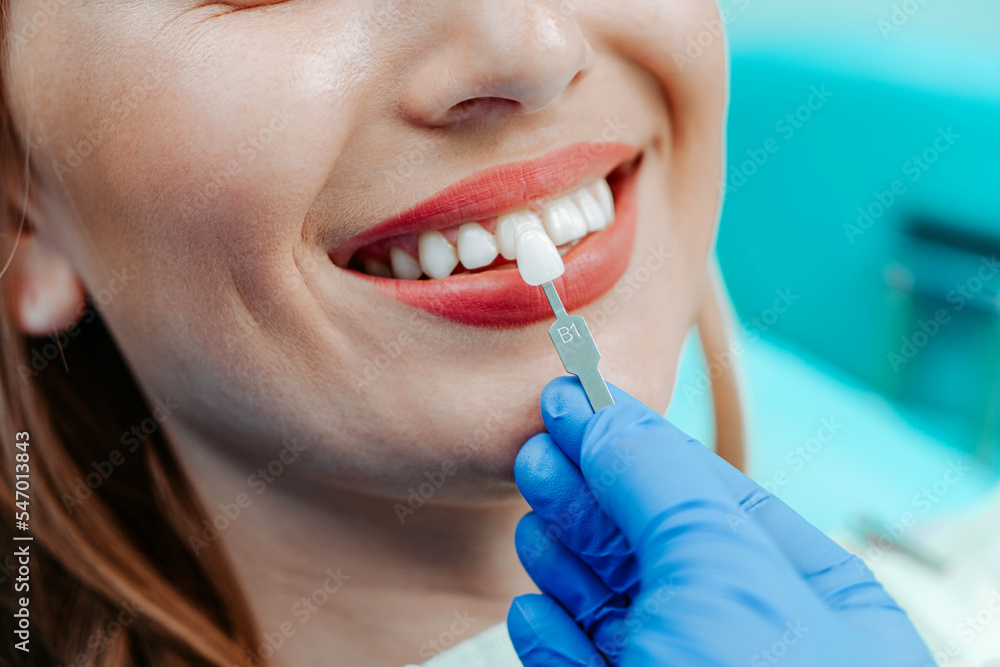 Smiling female mouth with natural white teeth in light blue background in dental clinic. Hands doctor dentist with teeth color palette next by face. Smile healthy teeth concept