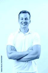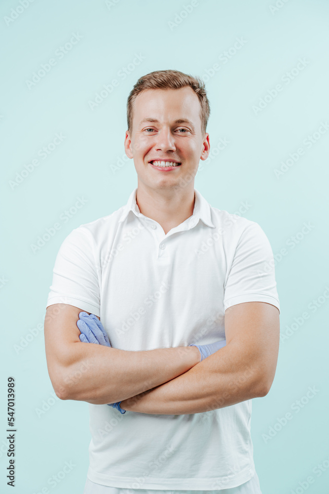 Doctor dentist smiling and standing with hands crossed on light blue background. Smile healthy teeth concept