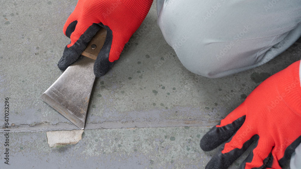 皮すきで床塗装の劣化を削る・下地処理|リフォーム・塗装業者イメージ