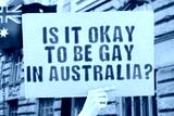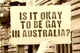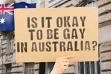 The question " Is it okay to be gay in Australia? " is on a banner in men's hands with blurred background. Friendly. Passionate. Contact. Date. Dating. Lover. Partner. Boyfriend. Pleasant. Approval