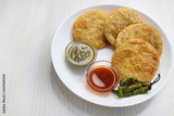 Shegaon Kachori or aloo pyaz ki kachodi served with green and red Chutney. Fried green chilies. it's a favorite Tea time snack, stuffed with lentils and spices mixture inside the dough. Deep fried.