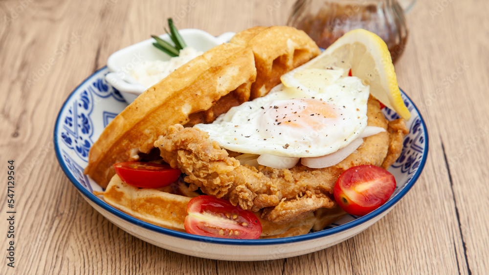 Waffle sandwich with fried chicken and egg