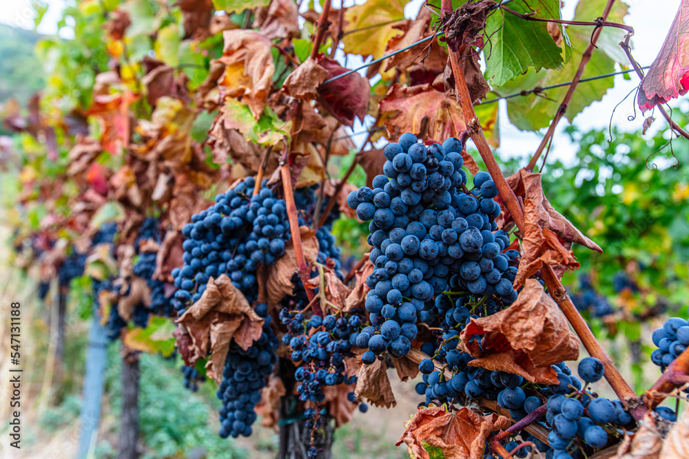 blue merlot grapes in autumn vineyard
