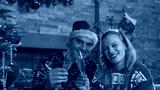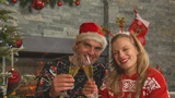 PORTRAIT: Cheerful couple toasting with glasses of champagne towards camera