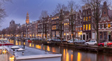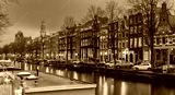 Beautiful old houses on the city waterfront of Amsterdam at sunset.