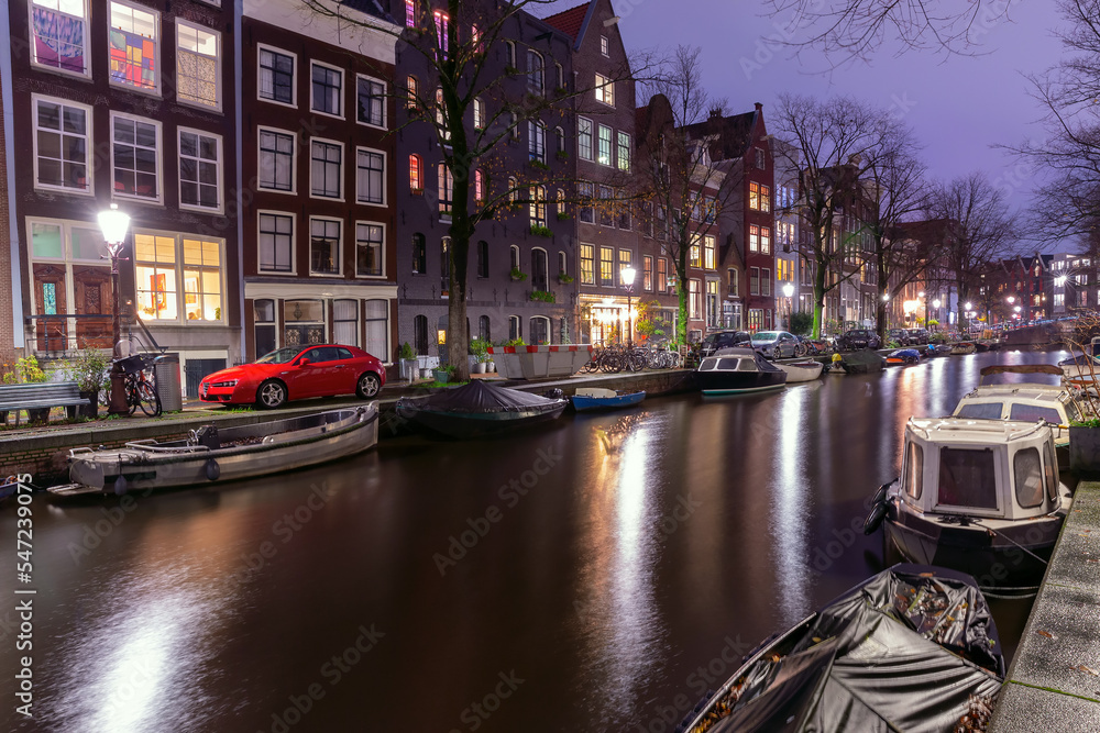 Beautiful old houses on the city waterfront of Amsterdam at sunset.