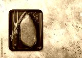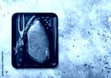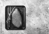 Raw beef steak sirloin fillet sealed in vacuum tray with pepper,rosemary and barbeque fork on light kitchen table background.