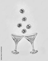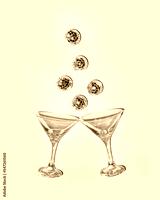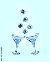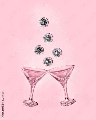 Glasses and shiny disco balls on pastel light pink background. Minimalistic party concept. Creative birthday composition. New Year cocktail idea.