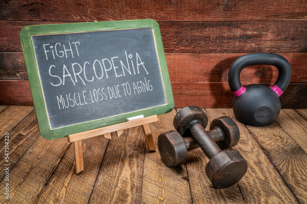 fight sarcopenia, muscle loss due to aging - inspirational message on a blackboard with dumbbells and a kettlebell, senior health and fitness concept