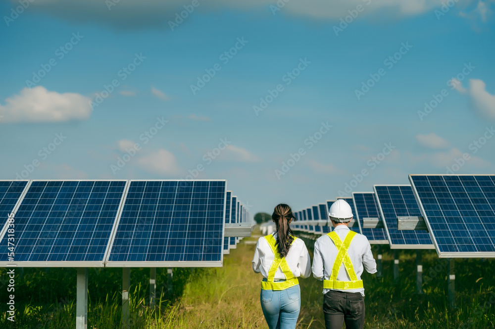 Asian Young Inspector Engineer man and female walking checking operation in solar farm