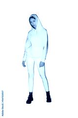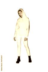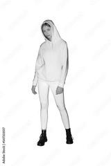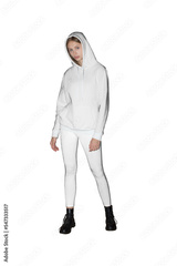 Young woman in a white hoodie and leggings. Mock-up. Png.