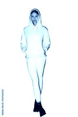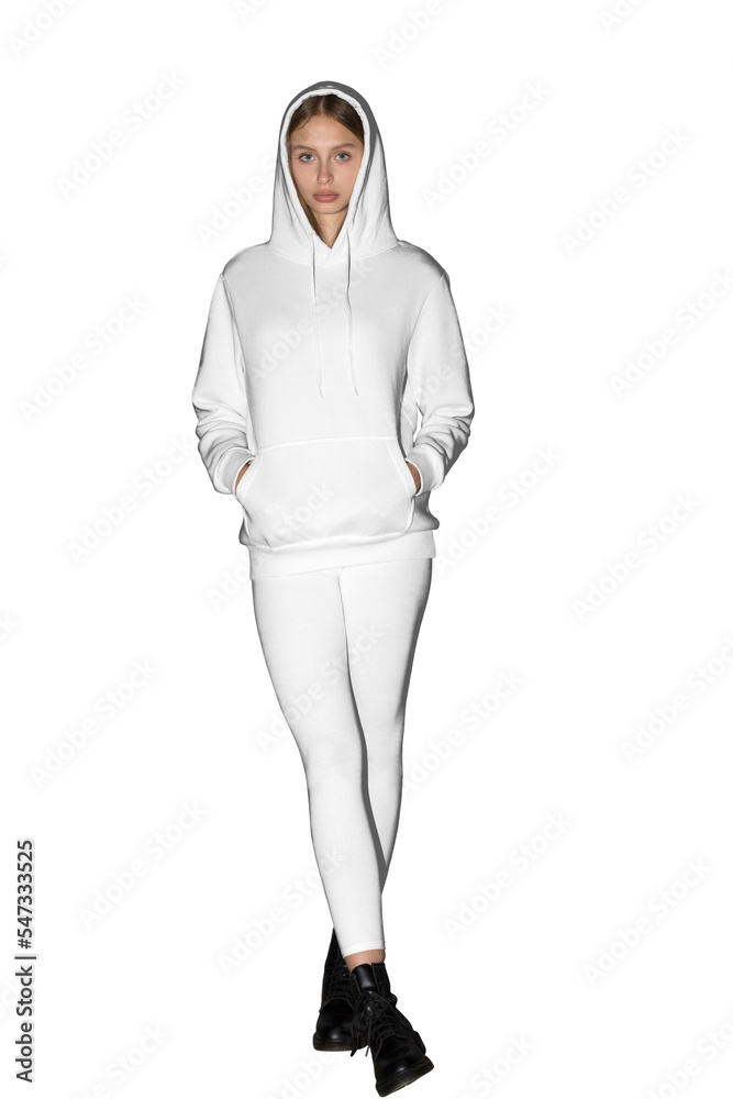 Young woman in a white hoodie and leggings. Mock-up. Png.