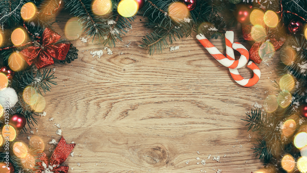 Christmas wreath with a congratulatory inscription on a wooden