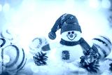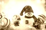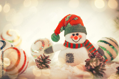 toy snowman and a gingerbread house on a light background.