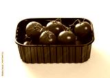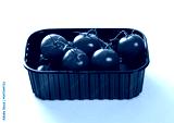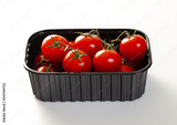 Plastic tray with fresh raw organic red tomatoes on white background.