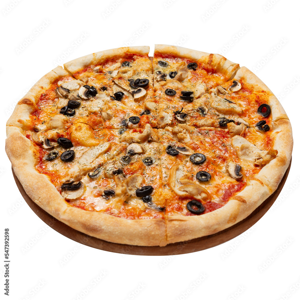 Italian pizza with chicken, cheese and olives, side view,, isolate
