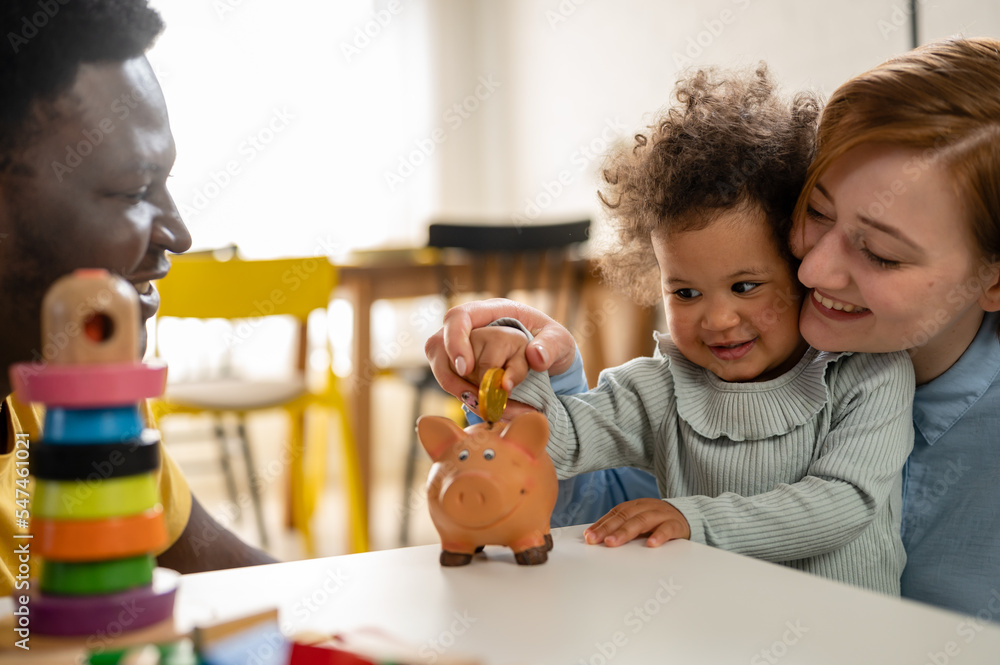 A child is putting a coin into a piggy- bank. Savings bank accounts for kids concept. Child saving money for future - concepts. Multi-ethnic family