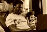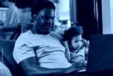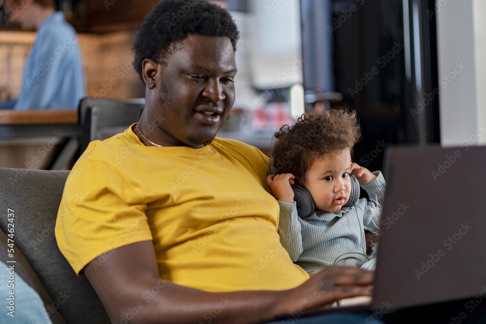 Father spends time with a cute daughter watching a laptop computer with her. Multicultural family. Educational apps for small kids.