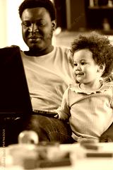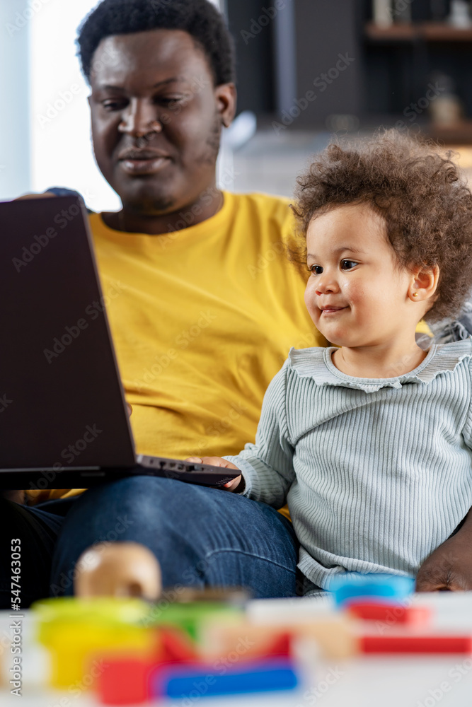 Father spends time with a cute daughter watching a laptop computer with her. Multicultural family. Educational apps for small kids.