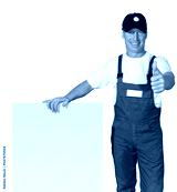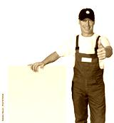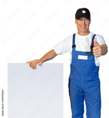 Craftsman series: sympathetic craftsman presents an advertising poster and gives a thumbs-up.