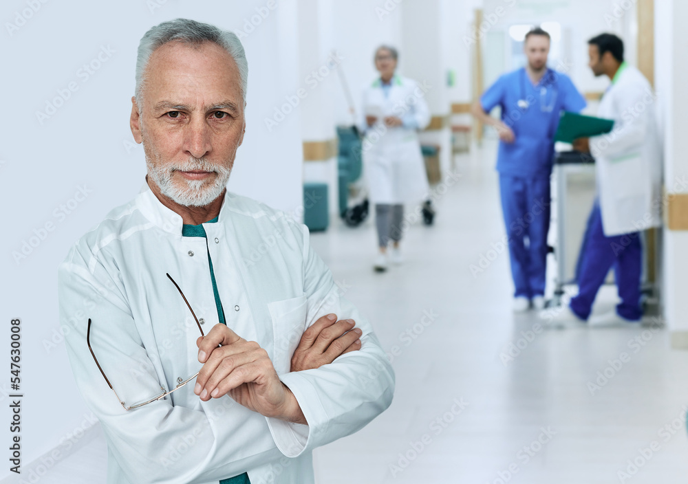 Experienced male general practitioner wearing medical uniform standing with arms crossed in modern medical clinic while working day, portrait