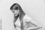Young caucasian woman isolated on beige background suffering from backache for having made an effort