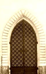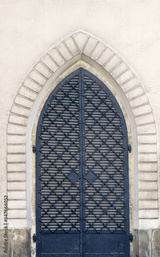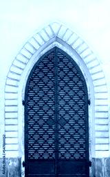 The vintage black metal front door of an old house