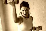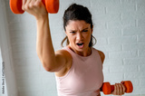 Smiling young woman working out with dumbbells at home. Daily exercise routine