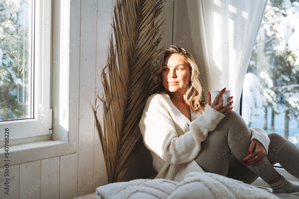 Young woman with blonde curly hair in white cardigan with cup of cocoa in hands looking at window with winter landscape at home
