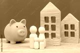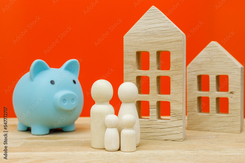 Happy family with children standing in front of their own house, Wooden figurines and a piggy bank, Concept of saving money for a dream house