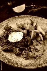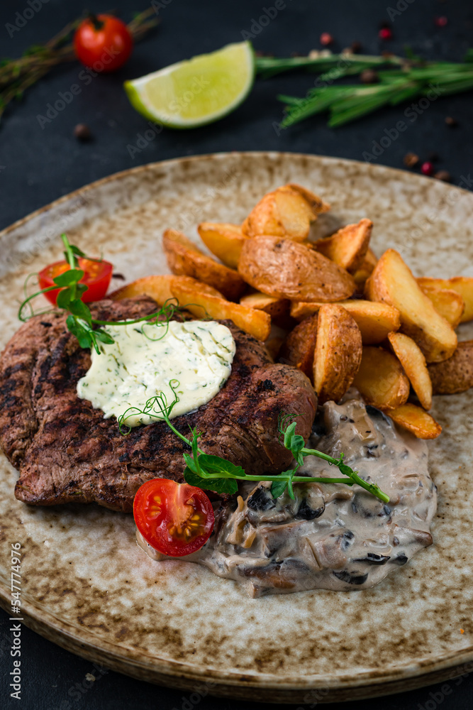 Lunch beef steak with mushroom sauce, potato wedges, tomatoes and green peas.