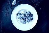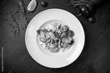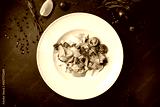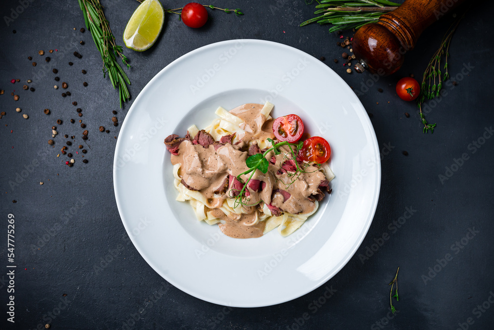 Italian pasta with roast beef, sauce, tomatoes and spices on a plate.