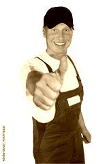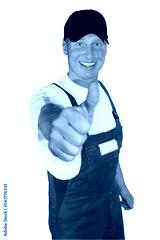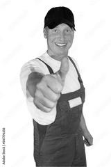 Craftsman series: sympathetic workman, shows thumbs up, work done, (face sharp, hand blurred)