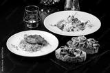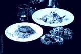 Italian food bruschettas with tomatoes, mozzarella, pesto sauce, sun-dried tomatoes and arugula with pasta Penne with porcini mushrooms